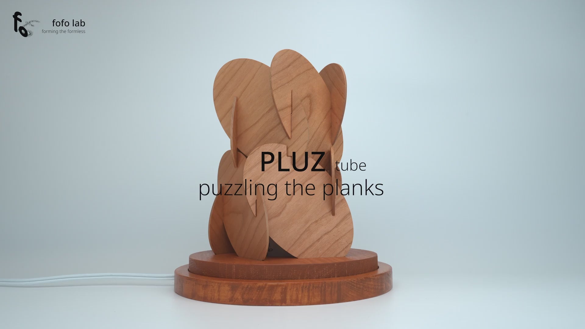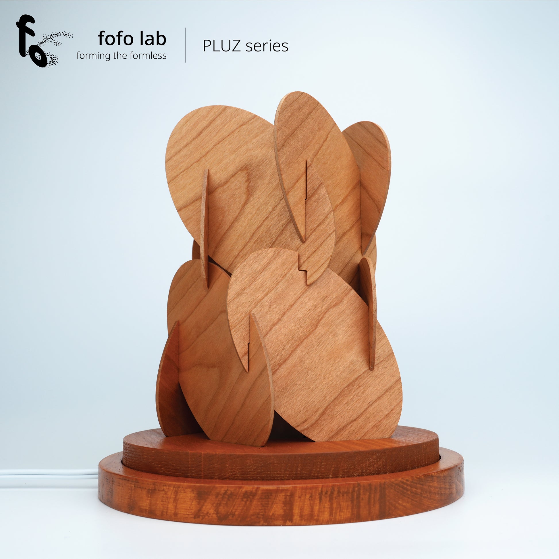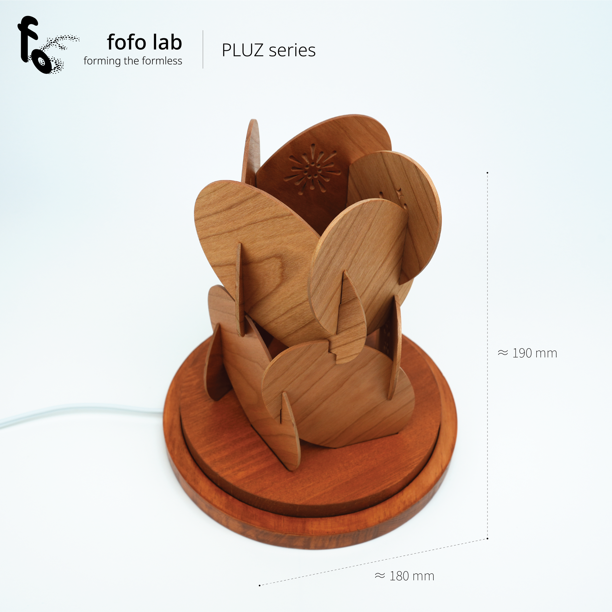This table lamp is crafted from ten precisely designed and processed pieces of solid cherry wood (2 mm thick). Applying the PLUZ series’ unique modular structure, each panel interlocks in space to create a sculptural three-dimensional effect.
